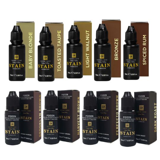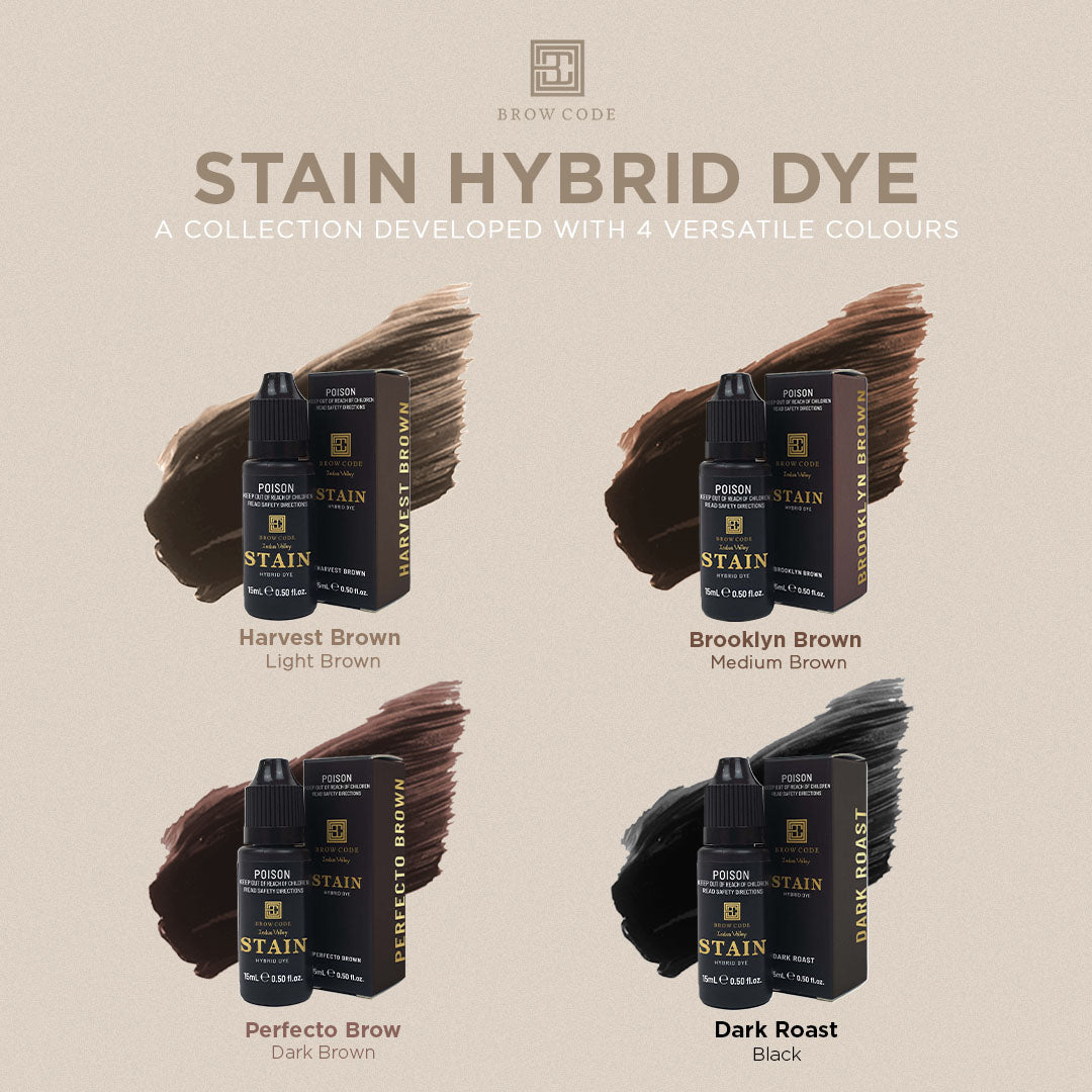 Stain has been designed for Professional Brow Stylists ready to take their services to the next level with a hybrid product. Formulated with a warm undertone to achieve extra-long-lasting results with shades that leave a powerful stain on the skin and brow hairs. The Hybrid Dye leaves a stain on the skin for up to ten days and on the brow hairs for up to six weeks.